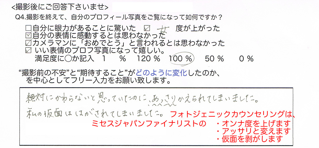 私は撮影が終わるとあなたの撮影ご満足度をお尋ねしています.以前の撮影結果に「100%満足」していても,必ずそれを上回り"500%"などという数字になることもあります.満足度質問の回答とは思えない数字ですが,それは,Amebloでもご確認下さいね.