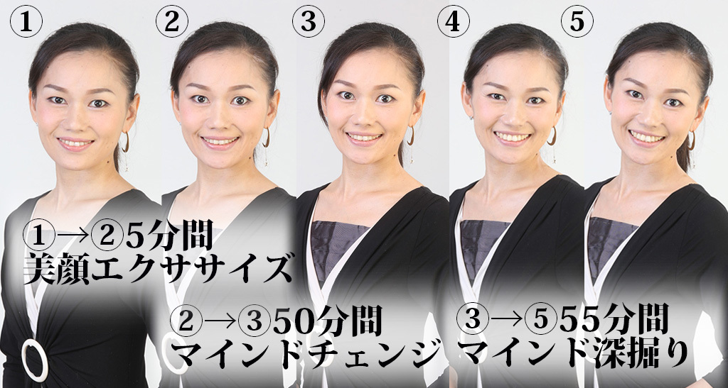 例えば観光地で記念撮影するときには,ピースサインでニッコリはあなたにとって日常のことと思いますが、このページに最初のBeforeAfter画像で比較すると一目瞭然かと思います.美顔エクササイズを覚えると一番右のように「ニコッと笑顔」で写れるようになります.