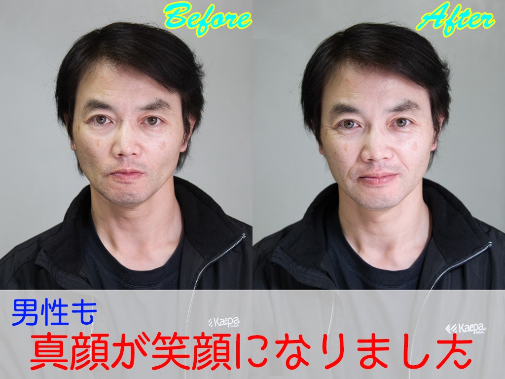 とのことでした。しかし、美顔エクササイズを行うと、僅か5分で写真のような変化です。そして、笑顔でも、目が大きく、口角がキュッと上がるようになりました。